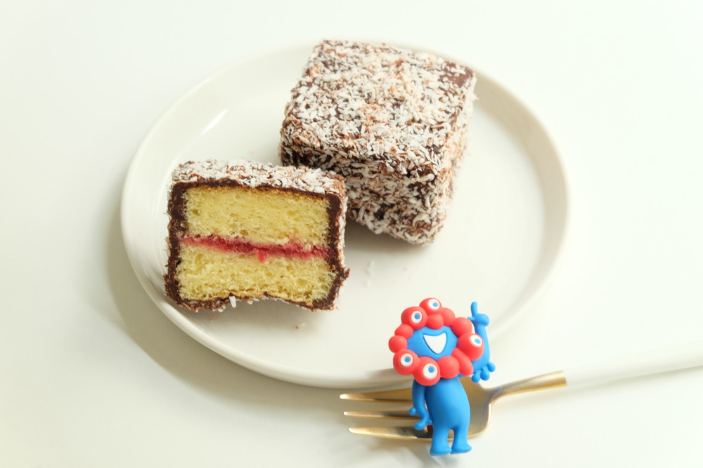 ラミントンは、オーストラリア発祥のお菓子で、スポンジにチョコレートとココナッツがまぶされています。スポンジの間にジャムなどを挟んだものもあるそうです。